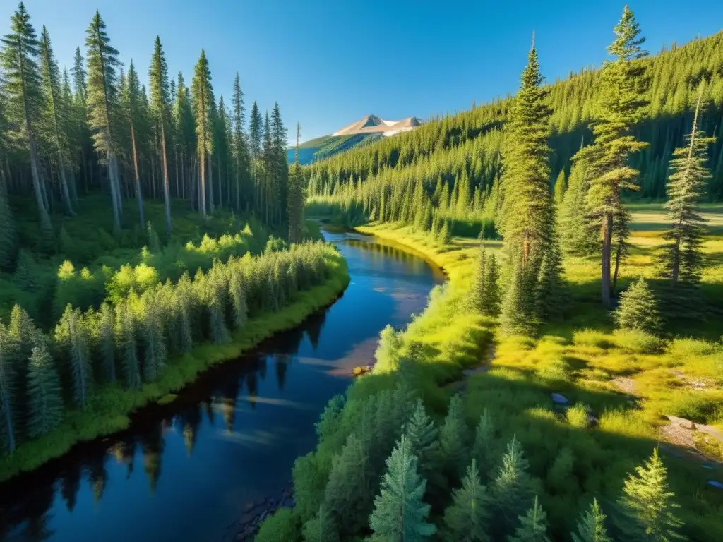 Imagen impresionante de la Taiga, con bosques frondosos, río cristalino y montañas nevadas