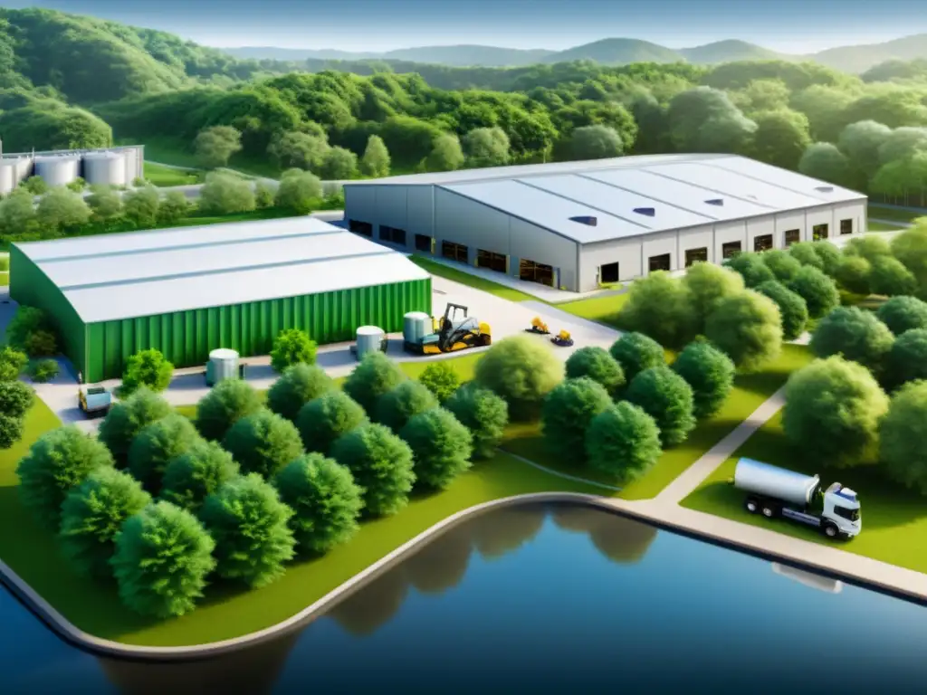 Vista aérea de instalación industrial moderna con energía sostenible y hermoso paisaje natural, demostrando la formación ISO 14001 Gestión Ambiental