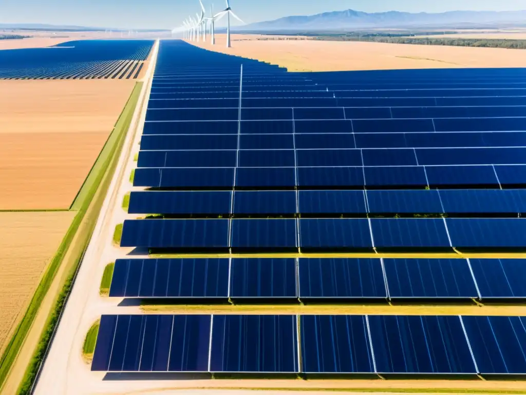 Una impresionante granja de paneles solares se extiende a lo largo de un vasto paisaje, reflejando el sol